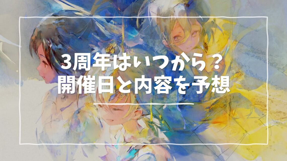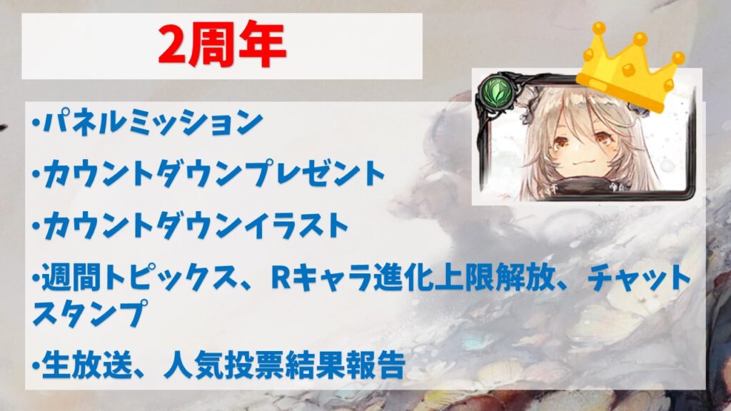2周年は、初めて生放送と人気投票がありました。今年も人気投票やってるので、結果発表を生放送でやってくれないかなーという気持ちがあるのですが、ゲーム内のお知らせで10月18日の17時に結果発表と書かれているので、Xとゲーム内で発表して終わりの可能性も?