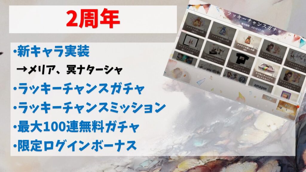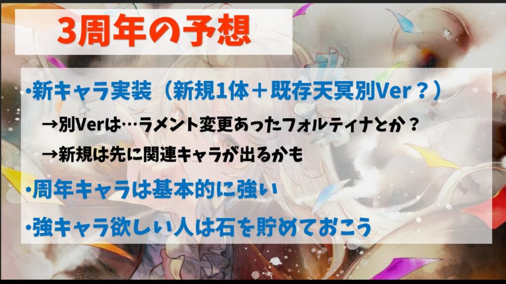 新キャラは2周年でセルリア→メリア(周年)の流れがあったので、同じように関連キャラ先出しの流れがあるかも。その方が新キャラに親しみ持ってもらえそうだし。